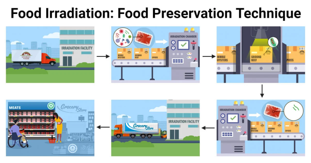 By slowing microbial growth and enzymatic activity, irradiation helps extend the shelf life of perishable foods like spices, grains, fruits, and meats.